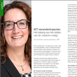 In het E-Magazine van Legal Business World van december schreef Eva Peeters een long read over alles wat er komt kijken bij ICT verandertrajecten in de advocatuur. Over pakketselectie, het belang van het stellen van de 'waarom-vraag' en het meekrijgen van je gehele organisatie.